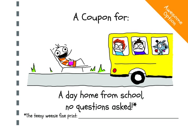 And if a coupon is just too darn “awesome” to give your child, you can tone it down with fine print. “A day home from school” can say “exam days not included”. And if you’ve got a little darling who might pick the awful option just to mess with you (you’re not alone), nix the temptation with creative fine print like: “available only in Azerbaijan”.