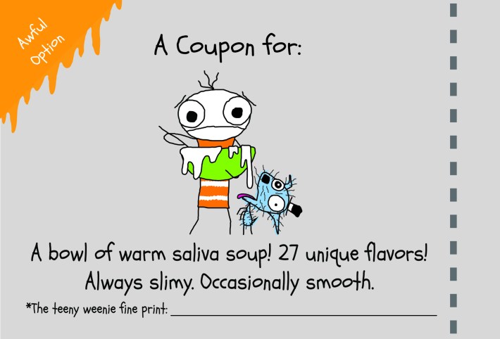 Why two choices? Because choosing is half the fun! And while it might be tough to choose between A day home from school and A bowl of warm saliva soup our kids need to learn they can’t have everything .